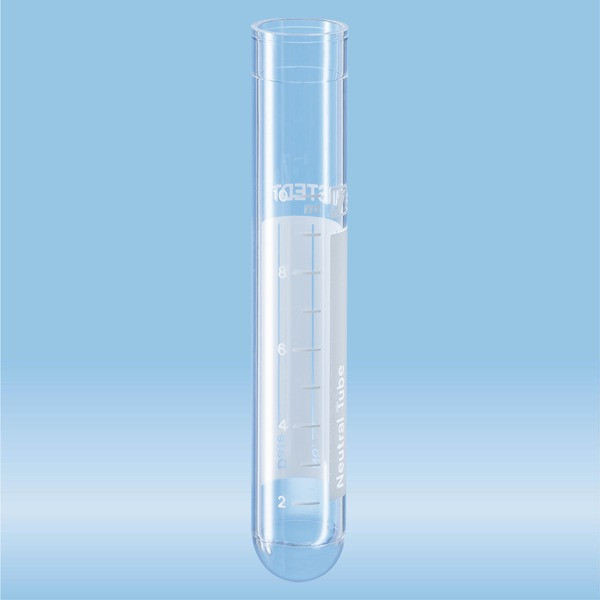 Product description | Tube, working volume: 10 ml, (LxØ): 95 x 16.8 mm, material: PS, round base, transparent, push cap, without cap, with print, label/print: white, with graduations, 500 piece(s)/bag |